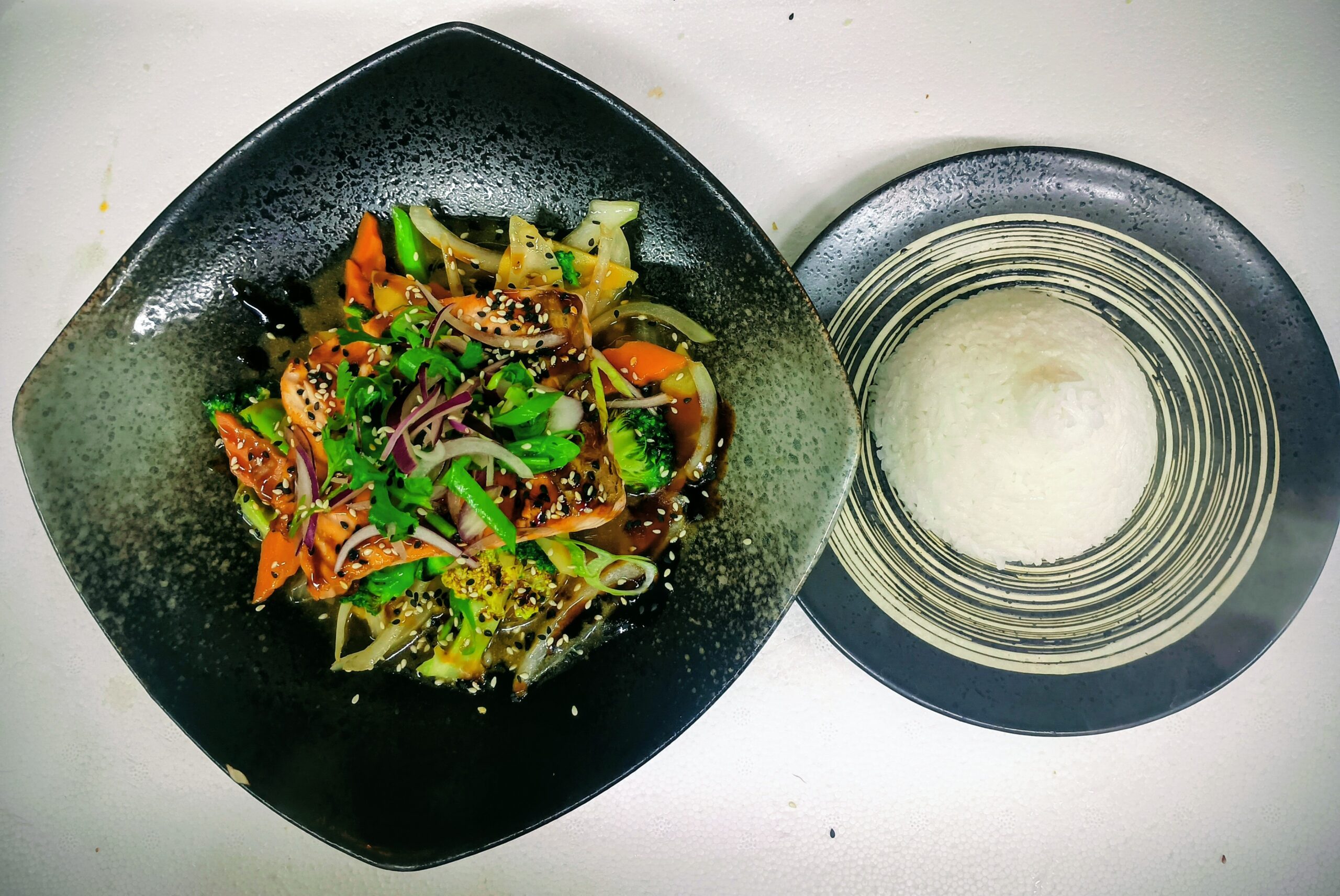 38.a. GRILOVANÝ LOSOS S RÝŽÍ, RESTOVANÁ ZELENINA S TERYIAKI OMÁČKOU